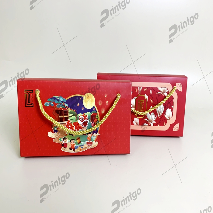 Ngoài ra, để làm tăng độ mịn cho sản phẩm, kỹ thuật gia công cán mờ cũng được sử dụng. Tất cả các hình ảnh, hoạ tiết được khắc hoạ trên hộp bánh đều vô cùng rõ nét và sinh động. Phần quai xách được đục oze, xỏ dây quai vàng, mang lại sự tiện lợi và tăng tính thẩm mỹ trong quá trình sử dụng.