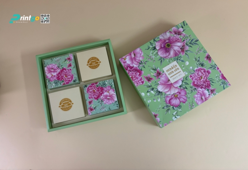 Mẫu hộp trung thu 4 bánh sử dụng kết cấu âm dương, với phần nắp và thân hộp ôm khít lấy nhau, mang đến cảm giác chắc chắn và sự trang nhã trong từng thao tác đóng mở. Đây là kiểu hộp được nhiều thương hiệu ưa chuộng bởi không chỉ đảm bảo độ bền và khả năng bảo vệ sản phẩm, mà còn giúp tiết kiệm chi phí sản xuất so với những cấu trúc cầu kỳ khác, trong khi vẫn giữ được tính thẩm mỹ cao. Kích thước hộp được tối ưu để đựng vừa 4 bánh trung thu, tạo sự cân đối, gọn gàng và thuận tiện trong khâu sắp xếp, vận chuyển hay trưng bày. Ngoài ra, Printgo có thể điều chỉnh kích thước linh hoạt theo yêu cầu, giúp doanh nghiệp dễ dàng tùy biến mẫu hộp sao cho phù hợp với từng loại bánh hoặc mục đích tặng biếu khác nhau.