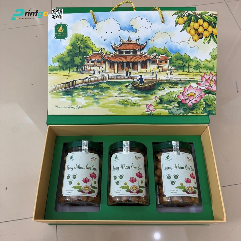 Long nhãn không chỉ là một đặc sản nổi tiếng của Hưng Yên mà còn là món quà mang đậm hương vị quê hương, thường được lựa chọn trong các dịp biếu tặng trang trọng. Để nâng tầm giá trị sản phẩm, bao bì đóng vai trò như lớp “áo khoác” thể hiện câu chuyện nguồn gốc và sự chỉn chu của thương hiệu. Mẫu in hộp nam châm cạnh đựng long nhãn Hoán Thúy Food được Printgo phát triển theo hướng sang trọng nhưng vẫn giữ được nét mộc mạc, gần gũi của đặc sản địa phương.