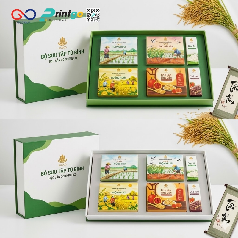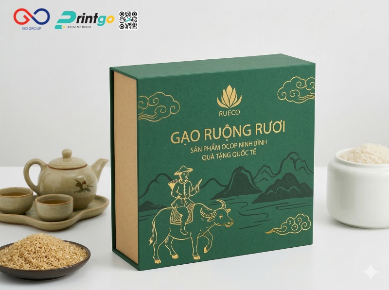 Giữa thị trường nông sản ngày càng đề cao yếu tố trải nghiệm và giá trị cảm nhận, một sản phẩm OCOP 5 sao như gạo rươi Ninh Bình cần nhiều hơn một bao bì thông thường để thể hiện đúng vị thế của mình. Không chỉ dừng lại ở chức năng bảo quản, bao bì còn trở thành công cụ định hình hình ảnh thương hiệu và gia tăng sức hút khi tiếp cận khách hàng. Từ định hướng đó, Printgo xin giới thiệu mẫu hộp nam châm đựng gạo rươi Ninh Bình, giúp sản phẩm sở hữu diện mạo sang trọng, chỉn chu và phù hợp với phân khúc quà tặng cao cấp.