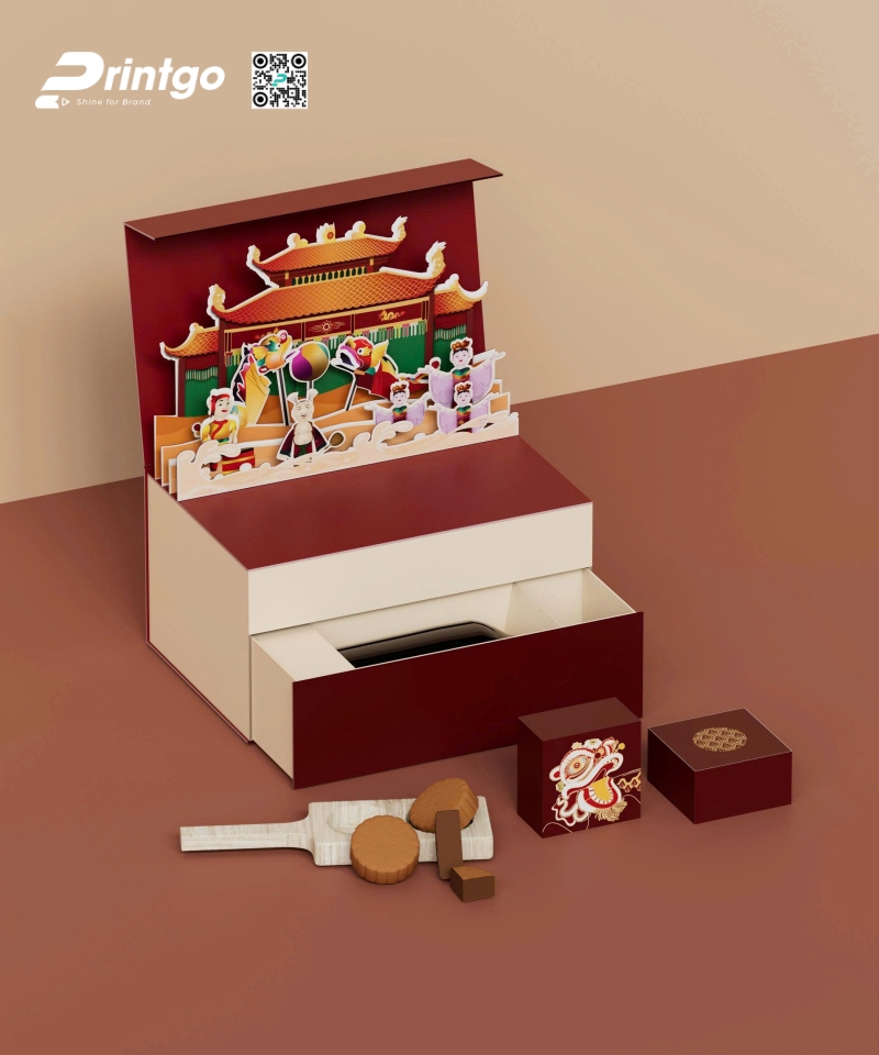 Tái hiện tinh thần dân tộc bằng ngôn ngữ thiết kế hiện đại, hộp popup 3D hai tầng Thủy Đình của Printgo là một trong những mẫu bao bì hiếm hoi mang đậm dấu ấn nghệ thuật múa rối nước truyền thống. Mẫu hộp này hứa hẹn là điểm nhấn khác biệt trong bộ sưu tập quà tặng Trung thu năm nay, không chỉ gây ấn tượng về mặt hình ảnh mà còn khơi gợi cảm xúc, giúp thương hiệu ghi dấu ấn mạnh mẽ với người nhận.