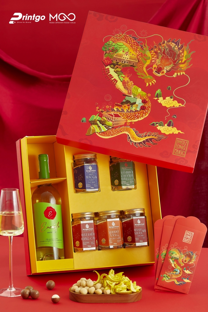 Mỗi chi tiết trên hộp quà tết đều làm tăng thêm giá trị văn hóa và tinh thần, làm cho món quà trở nên ý nghĩa hơn trong truyền thống ngày Tết của người Việt Nam. Đặc biệt hơn khi kết hợp cùng chất liệu giấy carton lạnh 2,5mm bồi C150 càng làm tôn lên vẻ đẹp sang trọng, tinh tế của ấn phẩm. Góp mình trong bộ sưu tập Hộp quà Tết 2024 độc quyền của Printgo, Ngự Long Quốc chắc chắn sẽ không làm khách hàng thất vọng, đáp ứng đầy đủ 3 tiêu chí: tinh tế, chuyên nghiệp, giá cả hợp lý.