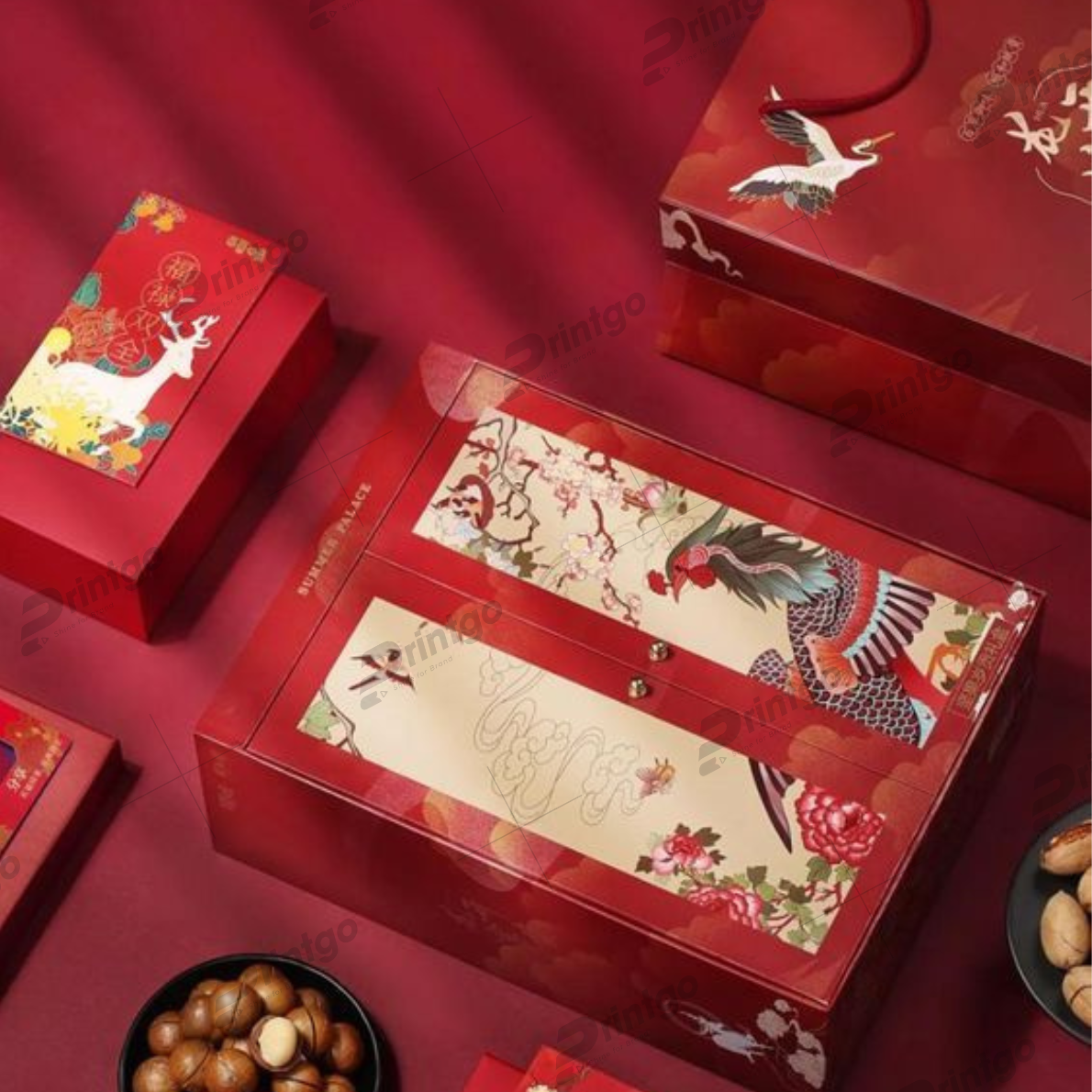 Hộp quà tết là một sự mới mẻ vè mặt hình thức, hình ảnh chim hạc được hiện lên làm tâm điểm cho chiếc hộp này. Với vẻ đẹp lộng lẫy, rực rỡ của chim hạc khiến cho hộp trở nên đẹp mắt, đây cũng là loài chim mang đến sự may mắn, tài lộc nên được chọn để khắc họa trên hộp như một ý nghĩa, thông điệp dành tặng riêng cho người nhận món quà này.