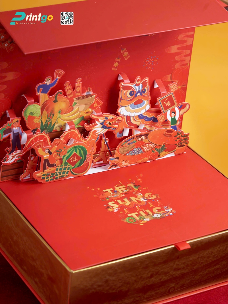 Không chỉ vậy, Printgo còn ứng dụng công nghệ cán mờ tinh tế trên bề mặt hộp, kết hợp với kỹ thuật ép kim logo và phủ UV họa tiết, tạo ra một diện mạo vừa sang trọng vừa ấn tượng. Các họa tiết sắc nét, nổi bật không chỉ làm tăng sức hút mà còn khiến hộp quà trở nên bắt mắt và cuốn hút ngay từ cái nhìn đầu tiên. Sự kết hợp hoàn hảo giữa các yếu tố này không chỉ làm tôn lên vẻ đẹp đặc biệt của thiết kế hộp quà tết nắp lật nam châm Popup 3D mà còn khẳng định đẳng cấp và sự tinh tế của thương hiệu, tạo dấu ấn mạnh mẽ và lâu dài trong tâm trí khách hàng.