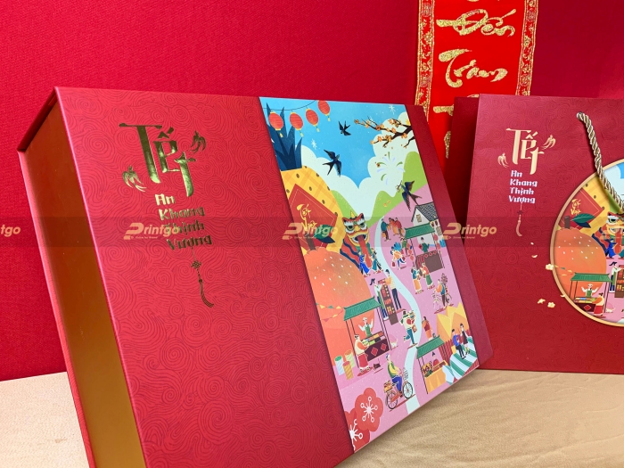 Để món quà trở nên cao cấp và sang trọng, Printgo lựa chọn giấy carton lạnh là chất liệu chính. Bởi ưu điểm rất cứng cáp, đựng được nhiều sản phẩm nặng, nhờ vậy hộp quà tết có thể bảo vệ những món quà giá trị bên trong. Lại dễ dàng di chuyển trong quá trình mang đi biếu, tặng. Để đảm bảo các hình ảnh thiết kế được thể hiện sắc nét và chi tiết nhất thì giấy couche bồi bên ngoài sẽ là lựa chọn lý tưởng cho hộp quà.