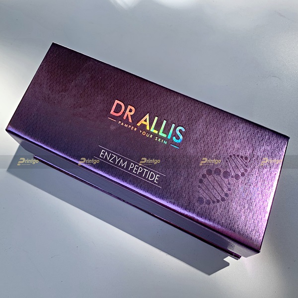 Đến từ thương hiệu Dr. Allis sang trọng và cao cấp, hôp sản phẩm PG-HSP22-04 được thiết kế vô cùng chắc chắn và mang đậm những dấu ấn riêng của thương hiệu. Chất liệu được lựa chọn là loại giấy carton lạnh có độ dày 1.5mm. Chất liệu này làm từ những sợi gỗ được nén ở mật độ cao nên có đặc tính cứng cáp và chịu được va đập tốt. Bên ngoài được bồi thêm 1 lớp giấy couche 150 gsm để màu in lên sắc nét, đầy đủ màu sắc như bản thiết kế. Tuy nhiên, để tạo được độ bóng và màu sắc tím đặc trưng của thương hiệu Dr. Allis thì chỉ bồi giấy couche thôi là không đủ. Printgo đã thực hiện gia công ghép màng metalize trên giấy couche, tạo nên bề ngoài màu tím sáng bóng mang đậm chất riêng của thương hiệu.