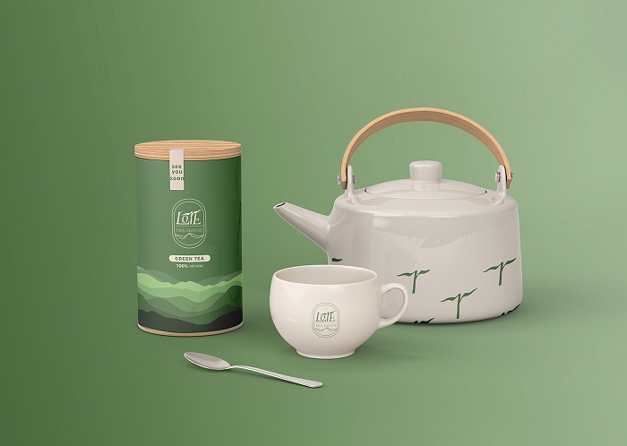 Ý tưởng thiết kế của hộp giấy cũng khá đơn giản, với màu sắc chủ đạo là màu xanh lá cây đúng với màu của trà. Đặc điểm này có thể giúp khách hàng hình dung bên trong hộp đang đựng sản phẩm gì. Tên hộp cũng được in chính giữa giúp in sâu vào tâm trí khách hàng.