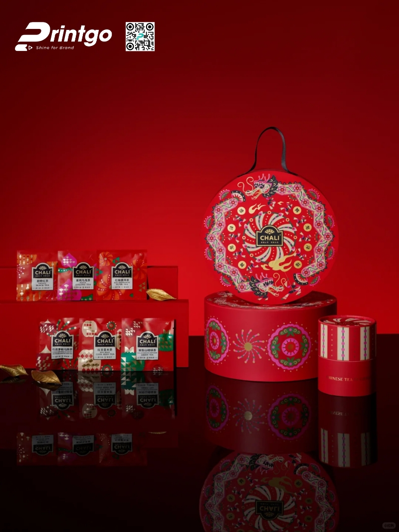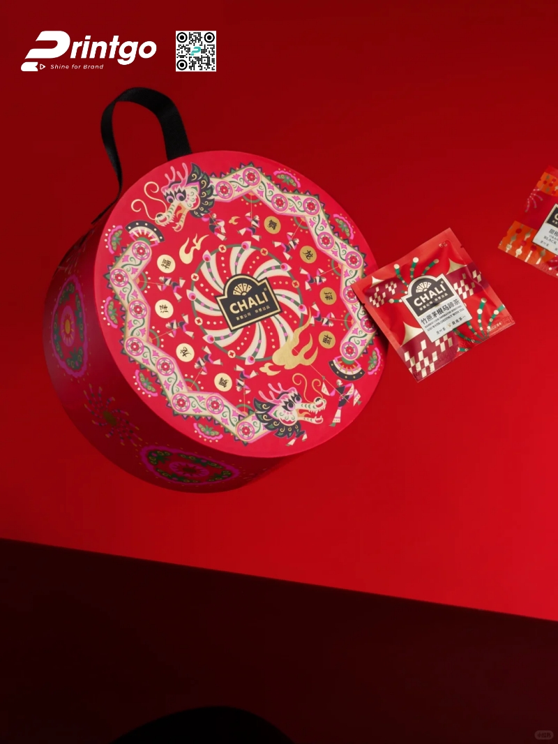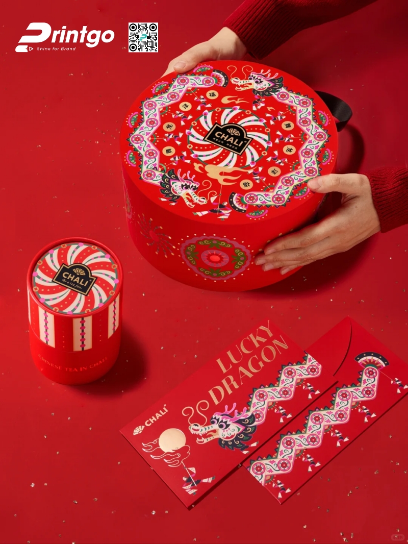 Mẫu hộp tròn đựng quà Tết được Printgo lấy cảm hứng từ hình tượng Rồng may mắn – biểu trưng cho quyền uy, thịnh vượng và năng lượng cát tường trong văn hoá Á Đông. Thiết kế sử dụng gam đỏ chủ đạo kết hợp cùng sắc vàng kim và hồng ngọc rực rỡ, gợi không khí tưng bừng, ấm áp của mùa xuân. Hình ảnh rồng uốn lượn quanh tâm hộp được xử lý theo bố cục tròn xoáy, thể hiện sự chuyển động, sinh khí và lời chúc phát đạt đầu năm. Mang hơi thở hiện đại nhưng vẫn đậm chất truyền thống, mẫu hộp là lựa chọn lý tưởng cho thương hiệu trà, bánh hoặc quà biếu cao cấp, hướng tới nhóm khách hàng trẻ trung, năng động và yêu thích thiết kế mang tinh thần lễ hội.