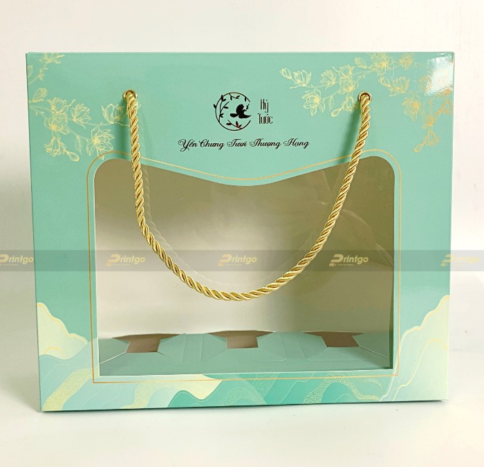 Quy cách hộp giấy mềm có dây quai xách được Printgo lựa chọn để thiết kế bao bì đựng yến chưng lần này cho Hỷ Tước. Đây cũng chính là dạng bao bì đang được lòng nhiều khách hàng.