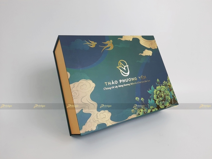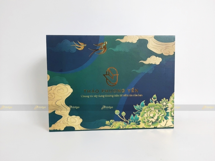 Trên nền xanh dịu dàng đó, những cánh chim yến và chùm hoa đua nở giúp cho tổng thể hộp trở nên hài hòa, không bị đơn điệu. Những chi tiết này đều được ép kim vàng nổi bật.
