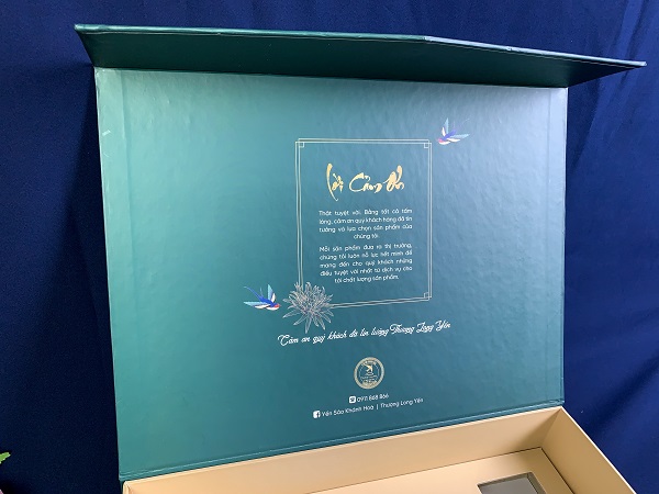 Vỏ hộp bên trong không quên in lời cảm ơn từ doanh nghiệp đến khách hàng vì đã tin tưởng sử dụng sản phẩm của công ty. Ngoài ra hộp thượng long yến còn chu đáo lưu lại số điện thoại và địa chỉ để khách hàng liên lạc khi cần thiết.