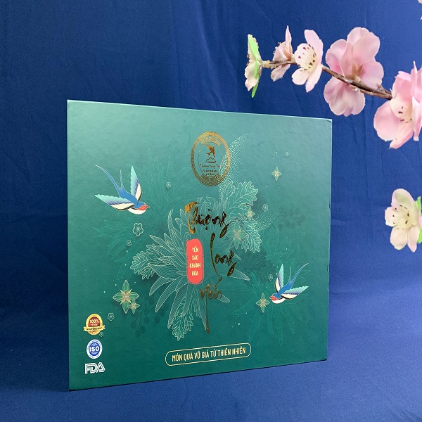 Hộp yến còn được điểm thêm sắc hoa rực rỡ để làm nổi bật đôi chim yến, biểu tượng của sản phẩm. Bên ngoài vỏ hộp, Printgo sử dụng công nghệ ép kim nhằm nhấn mạnh tên thương hiệu, logo doanh nghiệp và slogan.
