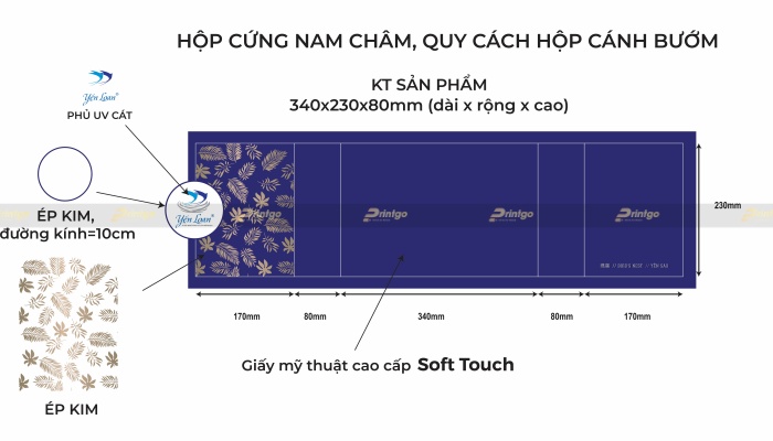 Hộp Yến Loan là loại hộp mở nắp cánh bướm, mở nắp nam châm, kích thước 340 x 230 x 80mm. Toàn bộ họa tiết bề mặt được ép nhũ vàng đẳng cấp, thanh lịch. Ngoài ra, tại vị trí logo còn được phủ lớp UV cát làm sáng bóng hình ảnh hiển thị mà ta có thể quan sát được bằng mắt thường. Vỏ hộp được làm bằng giấy mỹ thuật Soft Touch có độ bền cao cùng khả năng bám mực cực tốt, xứng đáng là lựa chọn hoàn hảo cho một sản phẩm thượng hạng như yến sào. Bên trong khay định hình chia thành 3 ngăn, giữ cho hàng hóa được cố định, chắc chắn khi vận chuyển.
