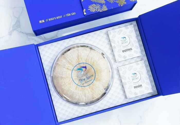 Tại Việt Nam nói riêng và các nước Á Đông nói chung, yến sào là mặt hàng quý, có giá trị đắt đỏ. Vì lẽ đó, thiết kế bộ hộp Yến Loan phải đảm bảo các yếu tố màu sắc được hài hòa, cân đối, tôn lên sự sang trọng của sản phẩm. Bao phủ toàn bộ bề mặt, hộp yến sào Yến Loan lựa chọn sắc xanh dương chủ đạo với ý nghĩa đại diện cho niềm tin, sự tin tưởng. Khi cầm trên tay mẫu hộp, chúng đem lại cảm giác dịu nhẹ, êm ái, có chút tươi mát và bình yên. Thiết kế hộp chia thành 2 phần rõ ràng, một bên là bề mặt trơn chỉ hiển thị tên sản phẩm, bên còn lại bao phủ bởi các họa tiết ánh kim nổi bật vô cùng bắt mắt. Logo thương hiệu đặt ngay ngắn ở vị trí trung tâm tạo điểm nhấn nổi bật; xung quanh là các họa tiết lá bắt mắt tạo nên bố cục cân đối và hài hòa.