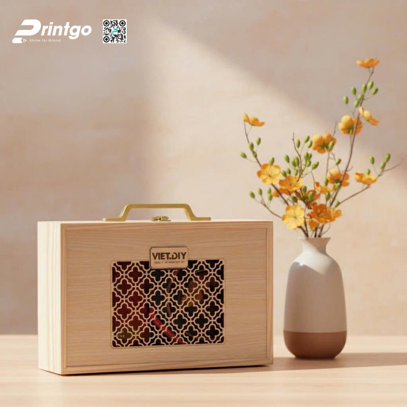 Xu hướng hộp quà Tết đang chuyển dịch rõ rệt sang các chất liệu bền vững, thân thiện và mang tính trưng bày cao. Doanh nghiệp không chỉ cần một mẫu hộp đẹp, mà còn cần một giải pháp bao bì thể hiện được trách nhiệm, gu thẩm mỹ và sự trân trọng dành cho người nhận. Nắm bắt xu hướng này, Printgo giới thiệu mẫu hộp gỗ đựng quà Tết - thiết kế kết hợp chất liệu gỗ mộc sang trọng, kiểu nắp lật tinh tế và quai xách tiện dụng, là lựa chọn lý tưởng cho doanh nghiệp đang tìm kiếm mẫu hộp Tết khác biệt cho mùa Bính Ngọ 2026.