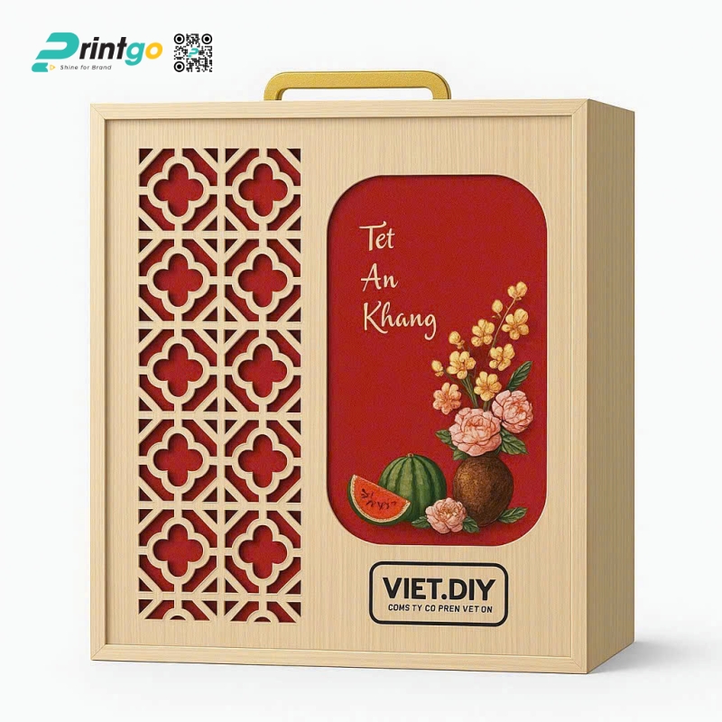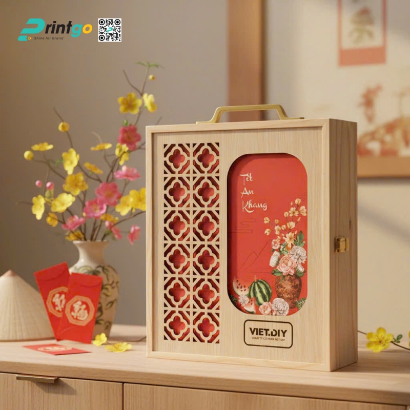 Trong thị trường quà Tết đang ngày càng đề cao tính bền vững và giá trị trưng bày, hộp gỗ quai xách Xuân An Khang trở thành lựa chọn nổi bật nhờ vẻ đẹp mộc mạc, sang trọng và độ bền vượt trội. Thiết kế hộp gỗ mang tinh thần Tết truyền thống kết hợp cùng kỹ thuật in ấn hiện đại giúp doanh nghiệp không chỉ gửi gắm lời chúc an lành, may mắn mà còn tạo dấu ấn thương hiệu riêng biệt trong mùa lễ hội. Cùng Printgo tìm hiểu chi tiết về mẫu hộp ngay sau đây!