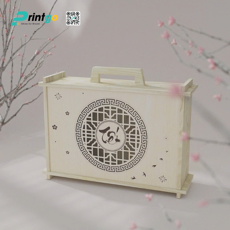 Bên cạnh đó, các chi tiết nhỏ như hoa mai, chim én và đường họa tiết thanh mảnh được in laser tinh tế trên mặt gỗ, tăng thêm chất thi vị và tính nghệ thuật của sản phẩm. Sự kết hợp giữa tông gỗ sáng và hoa văn truyền thống giúp mẫu hộp mang đậm tinh thần an lành, phù hợp cho các bộ quà tặng hướng đến sự trang nhã và ý nghĩa trong mùa Tết.