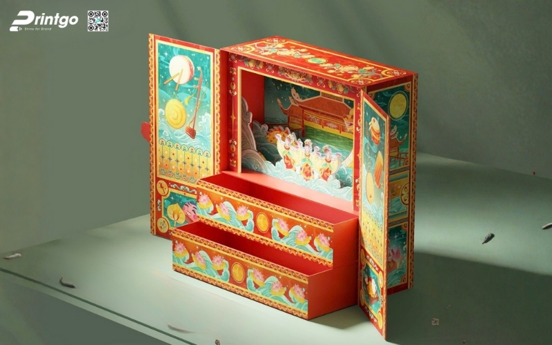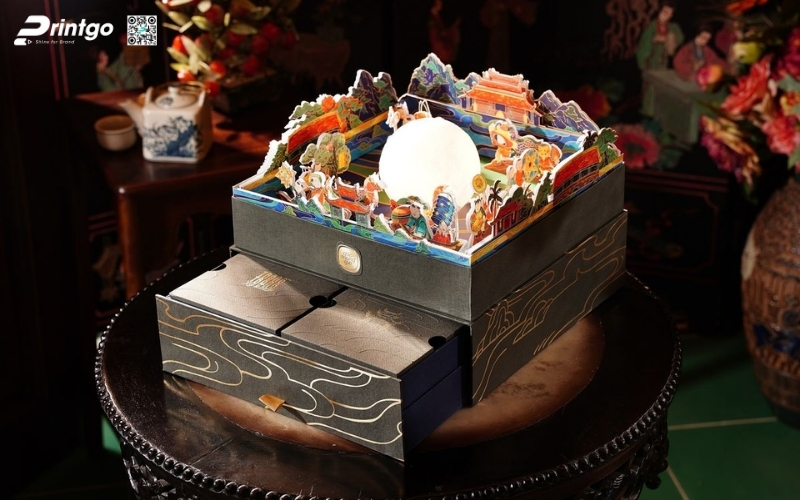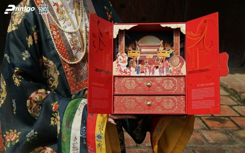 Khi mở nắp, các lớp, cánh hoa, hoặc những chi tiết mini hiện lên thành khung cảnh ngày tết, tất cả được sắp xếp khéo léo trên hai tầng. Mẫu này thích hợp cho doanh nghiệp muốn kể câu chuyện thương hiệu bằng hình ảnh sống động, đồng thời mang lại trải nghiệm cảm xúc mạnh mẽ cho người nhận.