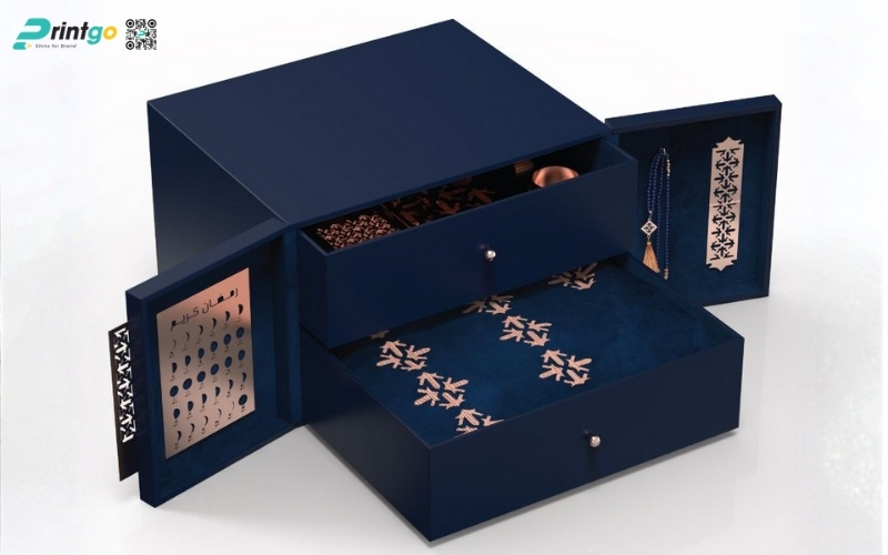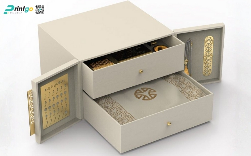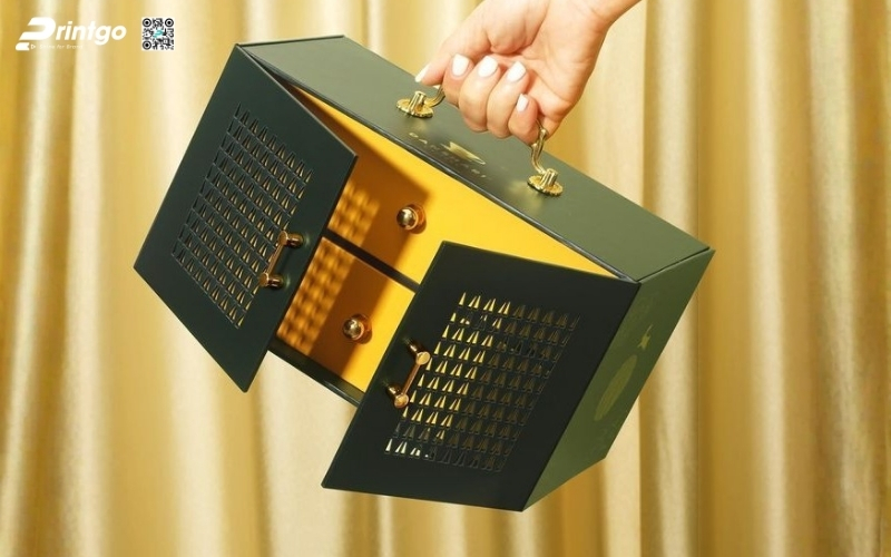 Đảm bảo kết cấu chắc chắn, cân đối: Hộp quà hai tầng cần được thiết kế vững, không nghiêng lệch hoặc dễ bung khi di chuyển. Nên sử dụng khay định hình hoặc foam để giữ sản phẩm cố định bên trong.