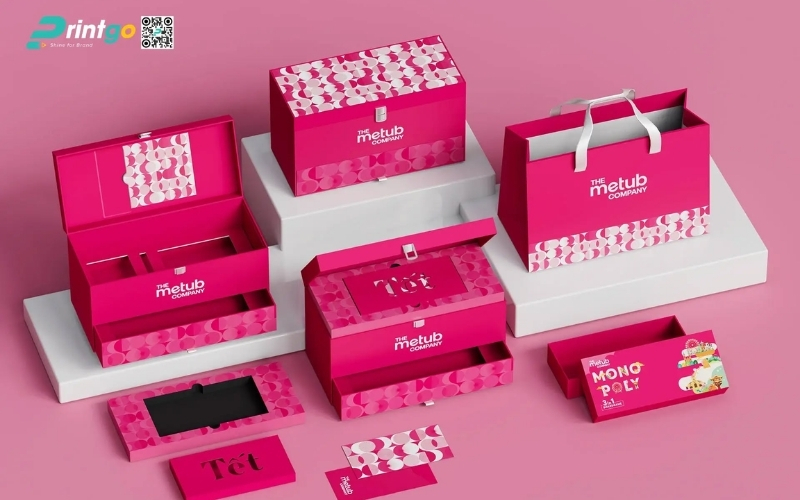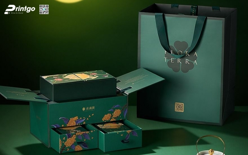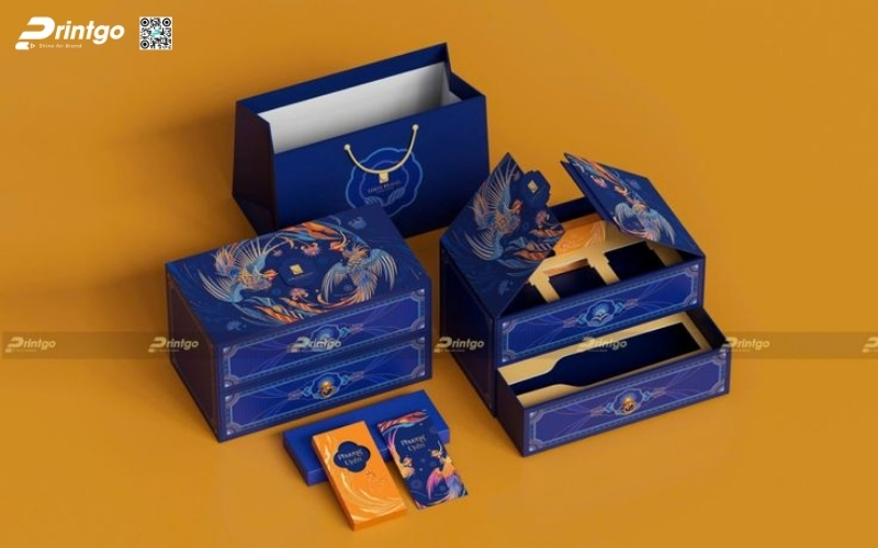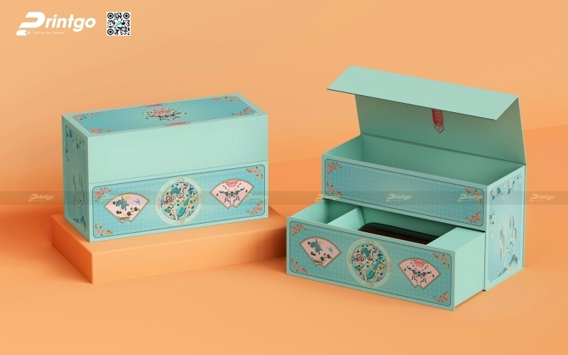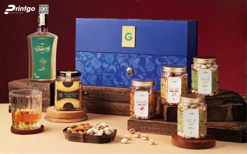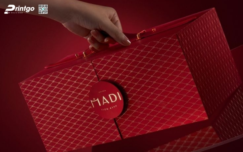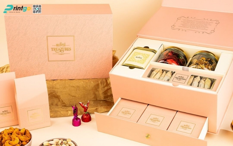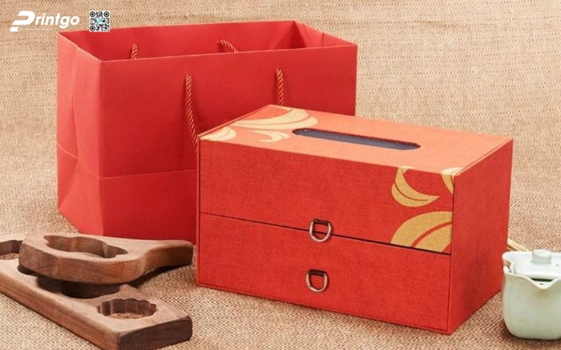 Đa dạng chất liệu gia công tinh xảo: Printgo sử dụng các loại giấy cao cấp như giấy Ivory, Couche, Kraft, giấy mỹ thuật nhập khẩu, kết hợp công nghệ ép nhũ, dập nổi, phủ UV, cán mờ hoặc bóng... giúp hộp quà vừa chắc chắn, vừa sang trọng.