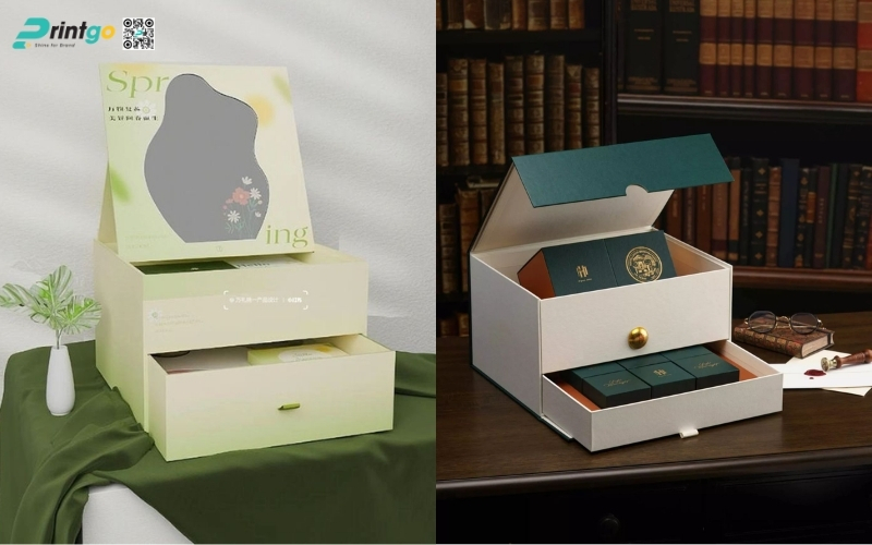 Hộp dạng kéo (Drawer box): Đây là kiểu hộp có thiết kế tương tự như một ngăn kéo nhỏ, khi mở chỉ cần kéo nhẹ từng tầng ra. Mỗi tầng là một ngăn quà riêng biệt, tạo cảm giác tò mò và thích thú khi mở.