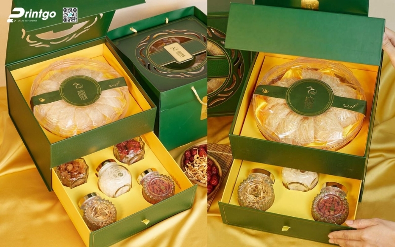 Ngành dược phẩm & chăm sóc sức khỏe: Các sản phẩm như thực phẩm bổ sung, nhân sâm, đông trùng hạ thảo, yến tinh chế, tổ yến chưng sẵn rất phù hợp để đóng gói trong hộp 2 tầng, vừa an toàn khi vận chuyển vừa tôn giá trị món quà.