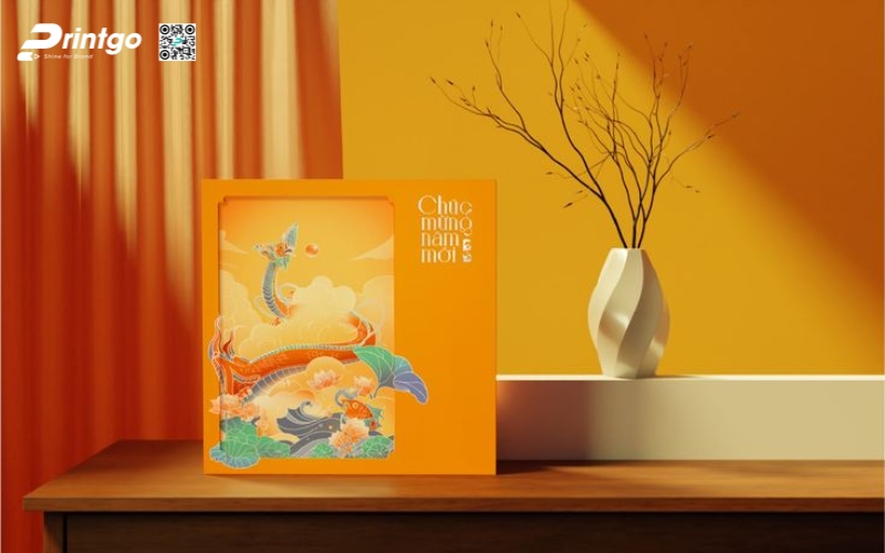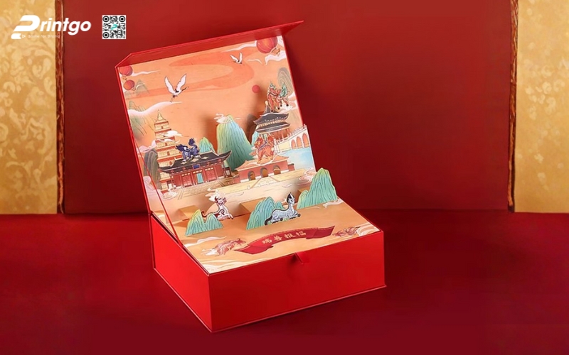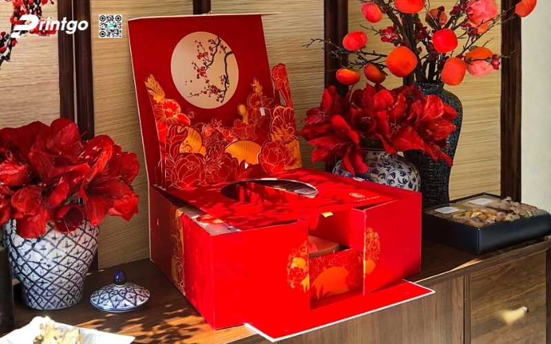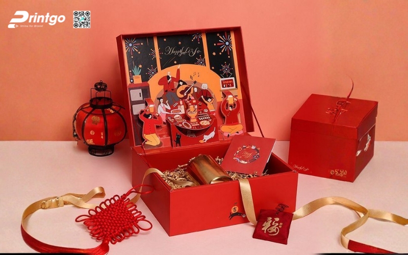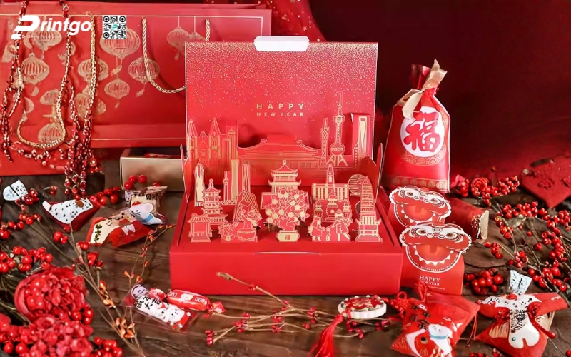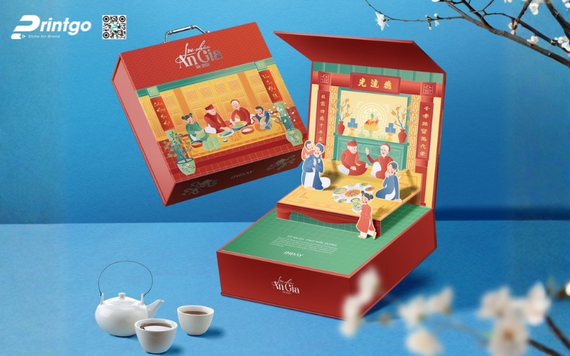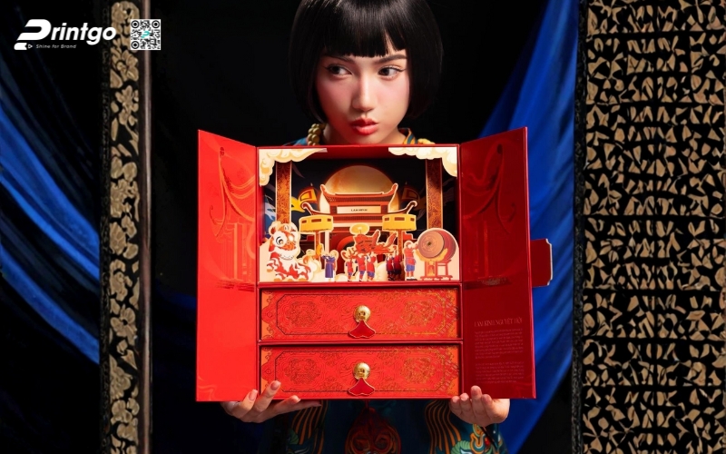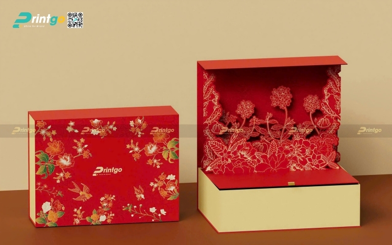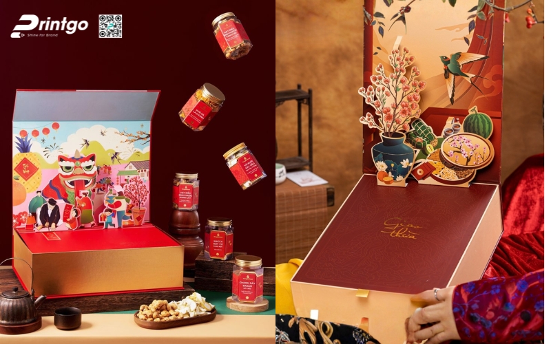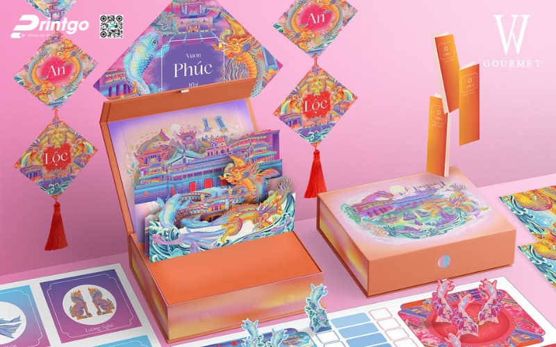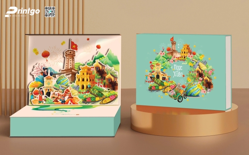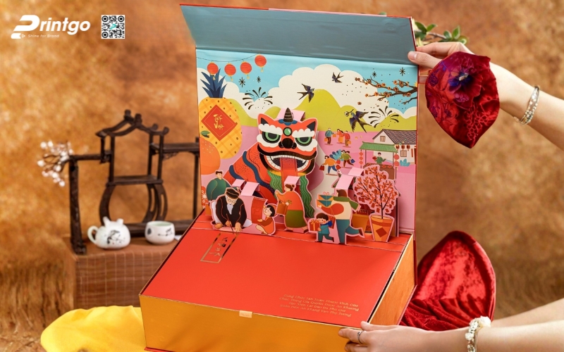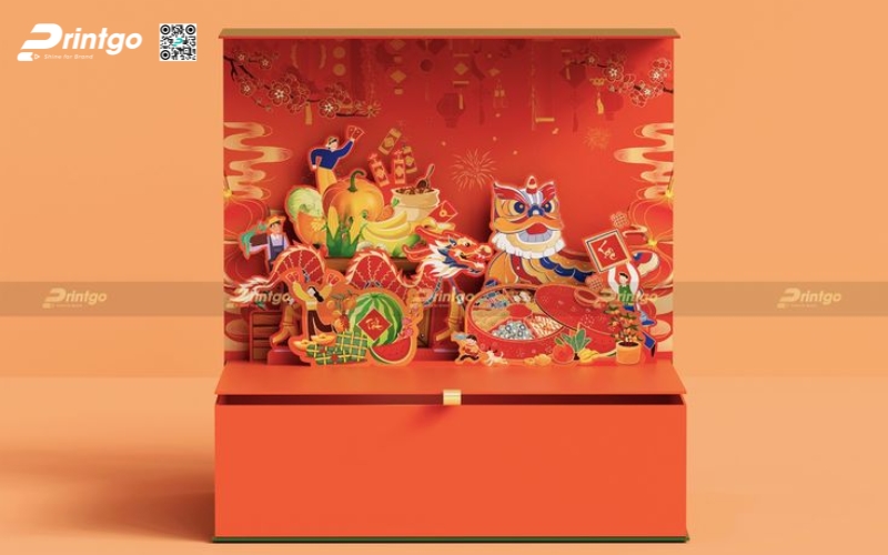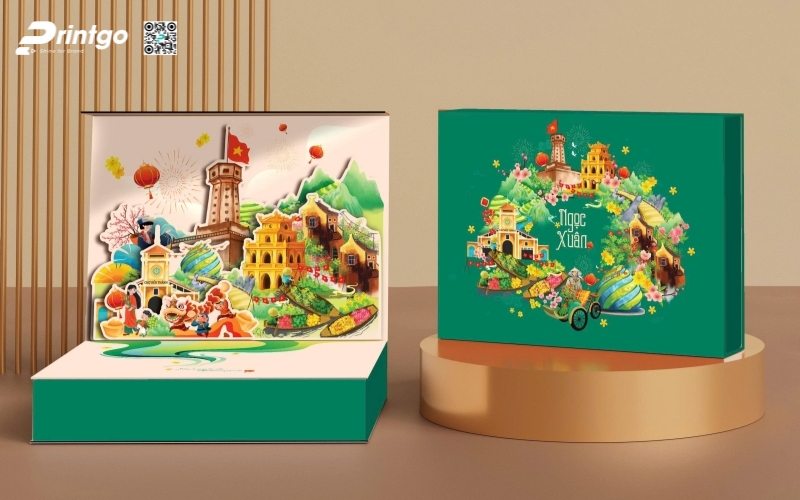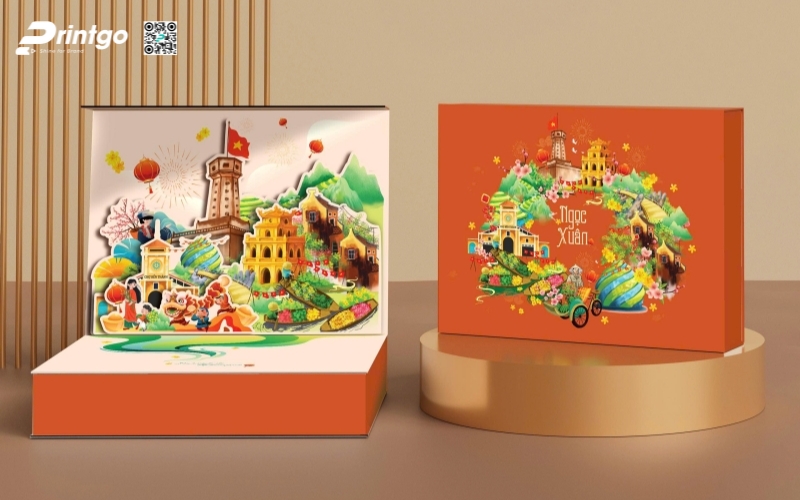 Dễ dàng tùy chỉnh theo yêu cầu: Printgo cung cấp dịch vụ thiết kế hộp quà Tết 3D/Popup theo yêu cầu, giúp doanh nghiệp dễ dàng tạo dấu ấn riêng biệt cho từng chiến dịch tri ân Tết.