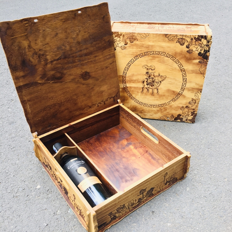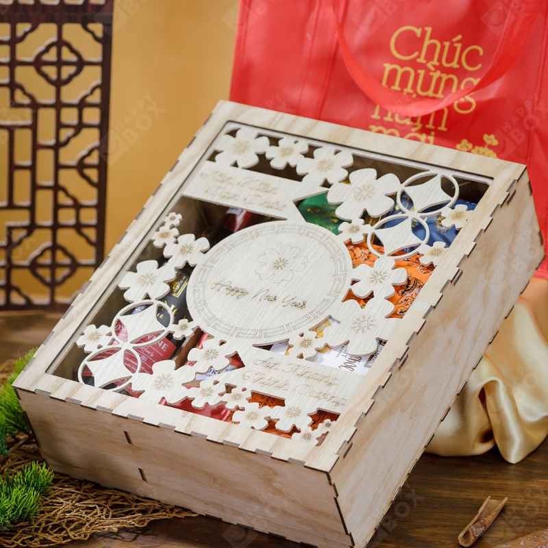 Hộp gỗ khắc laser: Ứng dụng công nghệ khắc laser hiện đại để trang trí logo thương hiệu, hoa văn hoặc thông điệp chúc Tết trực tiếp trên bề mặt gỗ. Mỗi hộp mang dấu ấn riêng, thể hiện sự tinh xảo và cá tính thương hiệu, rất được ưa chuộng trong các chiến dịch quà tặng doanh nghiệp độc quyền.