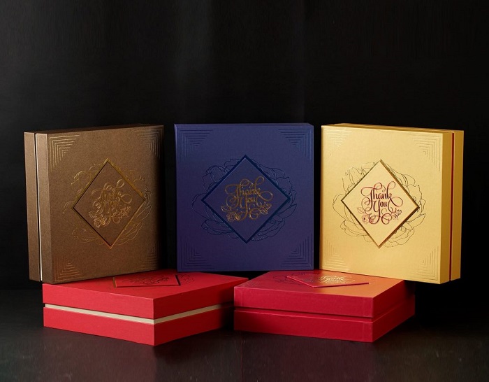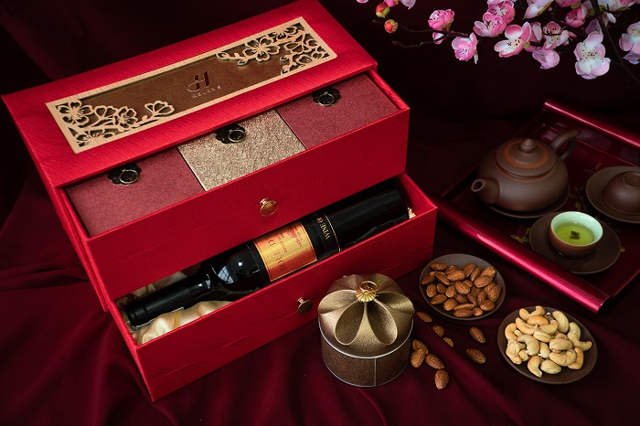 Có phần đặc biệt hơn so với các mẫu hộp quà thông thường, hộp quà Tết có sẵn ngoài phần thân hộp, nắp hộp còn được bố trí thêm một ngăn xếp đựng sản phẩm bên trong. Để nâng tầm giá trị món quà, bạn có thể yêu cầu đơn vị thi công lót thêm tấm vải lụa cho sang trọng hơn.