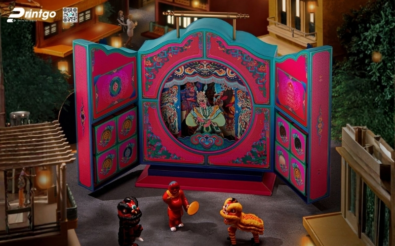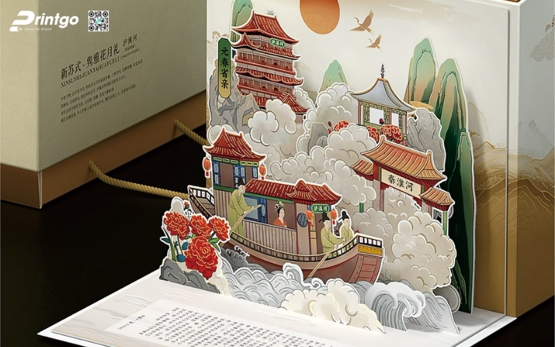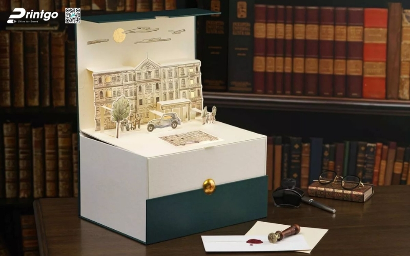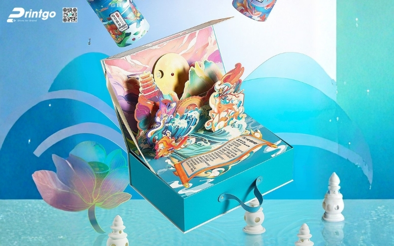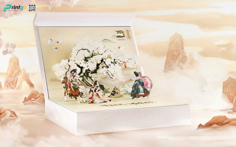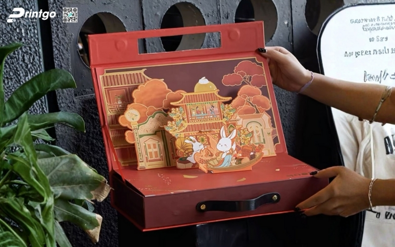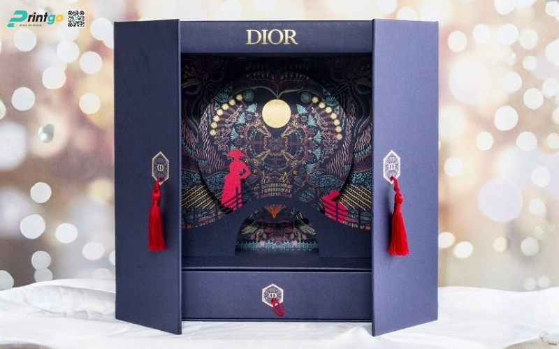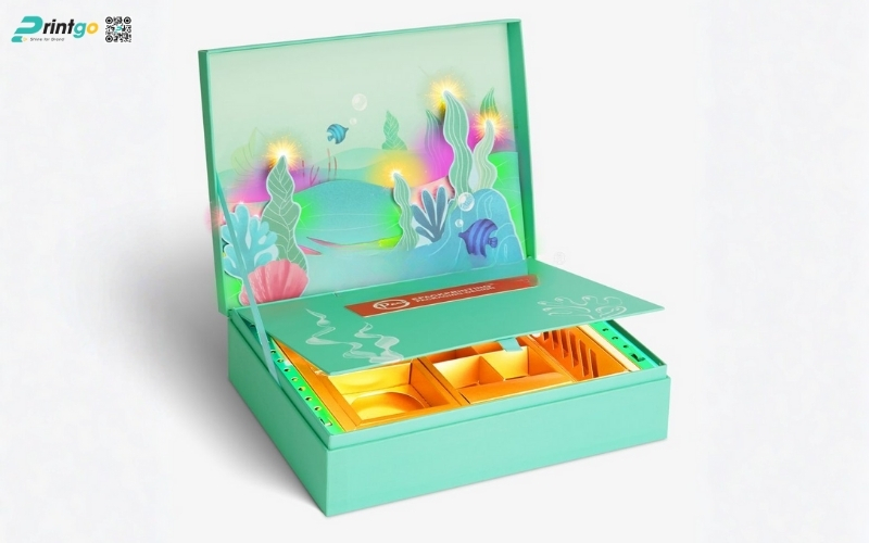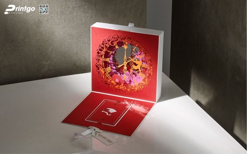 Hộp pop-up 3D: Hộp quà tết 3D nhìn bình thường giống chữ nhật hoặc vuông, nhưng khi mở nắp, bên trong các hình khối hoặc hoa văn 3D bật lên, tạo hình sinh động, người nhận nhìn là thấy ngay cấu trúc nổi bật.