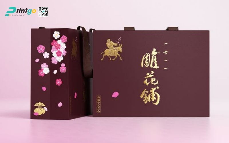 - Ép kim - bế nổi: Logo hoặc họa tiết được ép kim ánh vàng, bạc kết hợp bế nổi giúp tăng độ nhận diện và giá trị cao cấp cho hộp quà.