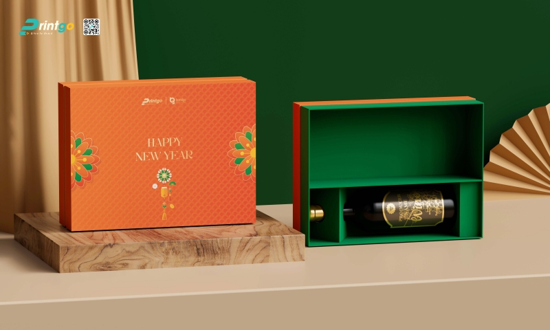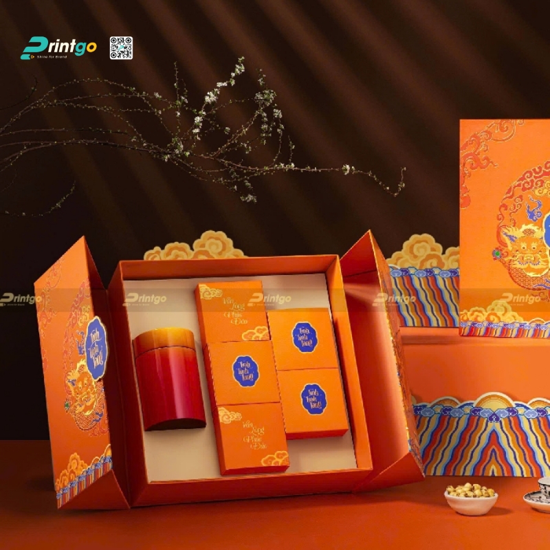 Nếu như sắc đỏ tượng trưng cho may mắn truyền thống, thì hộp quà tết màu cam lại mang đến làn gió mới của sự trẻ trung, năng động và tư duy sáng tạo không giới hạn. Là sự giao thoa hoàn hảo giữa nguồn năng lượng mạnh mẽ của màu đỏ và niềm hạnh phúc rạng ngời của màu vàng, sắc cam trong thiết kế bao bì gợi lên cảm giác ấm áp, thân thiện nhưng cũng đầy ắp khát vọng chinh phục những đỉnh cao mới trong năm Bính Ngọ. Tại Printgo, các mẫu hộp quà tết màu cam thường được xử lý khéo léo với kỹ thuật in chuyển màu (gradient) hoặc phối color-block hiện đại, giúp xóa bỏ hoàn toàn định kiến về sự "chói gắt", thay vào đó là vẻ đẹp thời thượng, nổi bật và cuốn hút thị giác ngay từ cái nhìn đầu tiên.