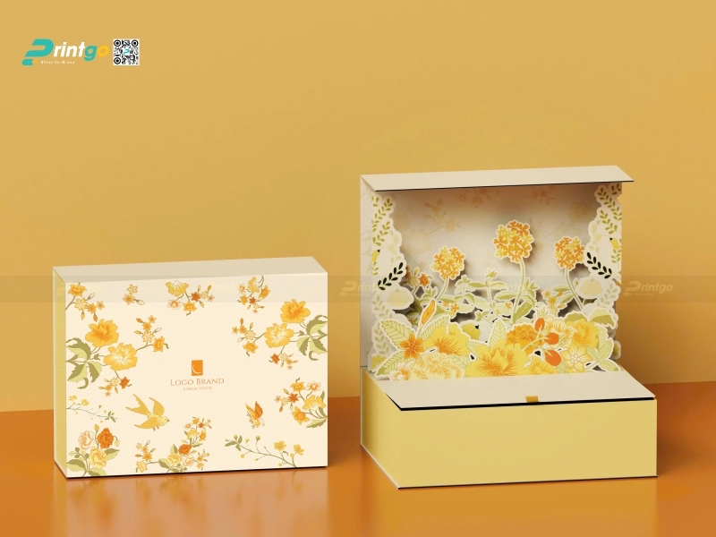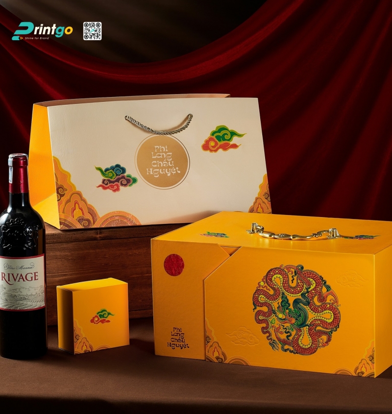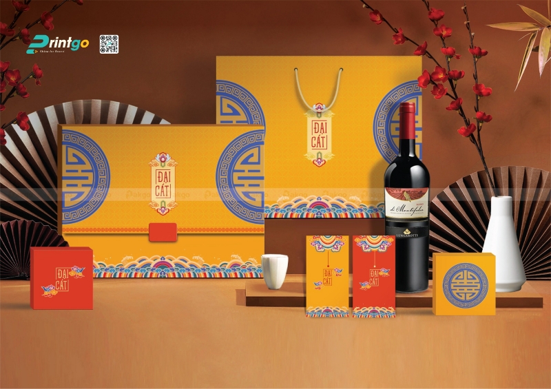 Bên cạnh sắc đỏ, hộp quà tết màu vàng cũng là một mảnh ghép không thể thiếu trong bức tranh đa sắc của thị trường quà Tết, đại diện cho quyền lực hoàng gia và sự giàu sang phú quý. Màu vàng ánh kim (Gold) hay vàng đồng thường được sử dụng để tôn vinh đẳng cấp của món quà, gợi liên tưởng đến những thỏi vàng ròng hay những cánh đồng lúa chín vàng bội thu, mang ý nghĩa về sự sung túc và thành công viên mãn. Printgo thường tư vấn cho khách hàng sử dụng các loại giấy mỹ thuật có ánh nhũ ngọc trai hoặc cán màng Metalize để tăng hiệu ứng bắt sáng cho hộp quà tết màu vàng, biến bao bì thành một tác phẩm nghệ thuật thực thụ.
