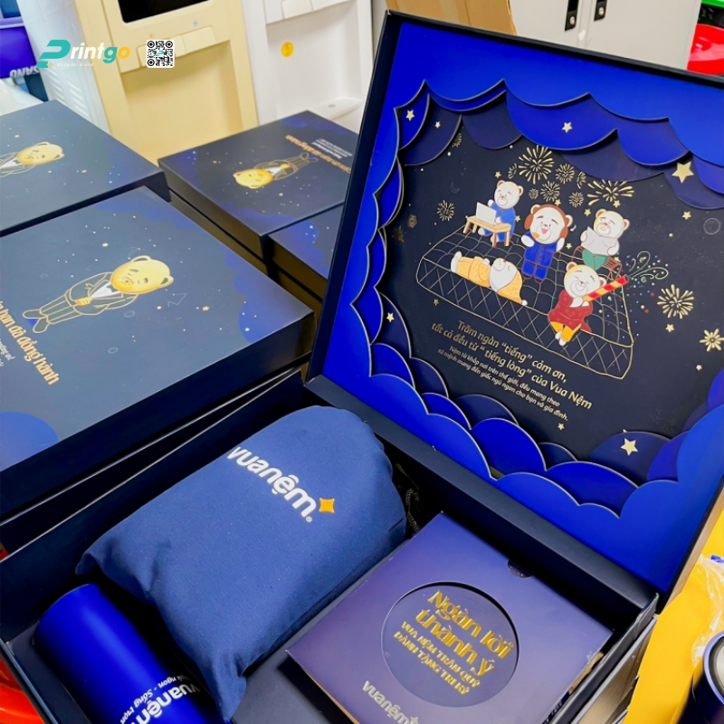 Khác với sự mềm mại của hai sắc xanh trên, hộp quà tết xanh dương (Navy Blue, Royal Blue) mang trong mình sự vững chãi, nam tính và chiều sâu của trí tuệ, tựa như bầu trời bao la hay đại dương sâu thẳm. Trong tâm lý học màu sắc ứng dụng trong marketing, màu xanh dương là gam màu đại diện cho sự tin cậy (trust), tính thẩm quyền (authority) và sự ổn định bền vững, những yếu tố cốt lõi mà bất kỳ doanh nghiệp lớn nào cũng muốn xây dựng trong tâm trí khách hàng. Chính vì vậy, hộp quà tết xanh dương luôn là "best-seller" trong danh mục quà tặng doanh nghiệp tại Printgo, đặc biệt là các mẫu hộp cứng (rigid box) nắp nam châm hoặc hộp âm cánh bướm cao cấp.