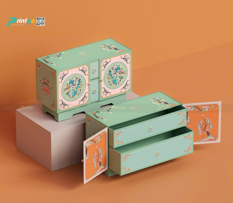 Nếu xanh lá mang vẻ đẹp của rừng già thì xanh ngọc (Turquoise) lại là báu vật của đại dương, đại diện cho vẻ đẹp quyền quý, thời thượng và một chút bí ẩn đầy quyến rũ. Các mẫu hộp quà tết màu xanh ngọc tại Printgo thường được đội ngũ thiết kế ưu ái kết hợp với các kỹ thuật gia công bề mặt phức tạp như ép kim (foil stamping) màu vàng gold, rose gold hoặc bạc để tạo nên hiệu ứng bắt sáng lộng lẫy. Sự tương phản giữa nền xanh ngọc mát lạnh và các đường nét kim loại ấm áp tạo nên một tổng thể hài hòa, vừa hiện đại lại vừa phảng phất nét cổ điển của phong cách Art Deco, nâng tầm giá trị món quà lên một đẳng cấp mới.