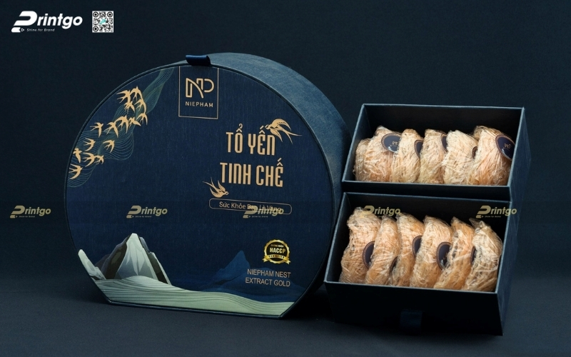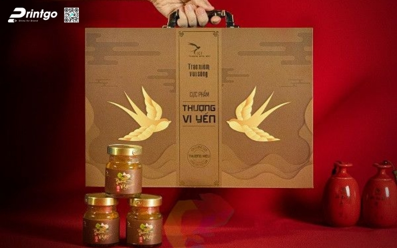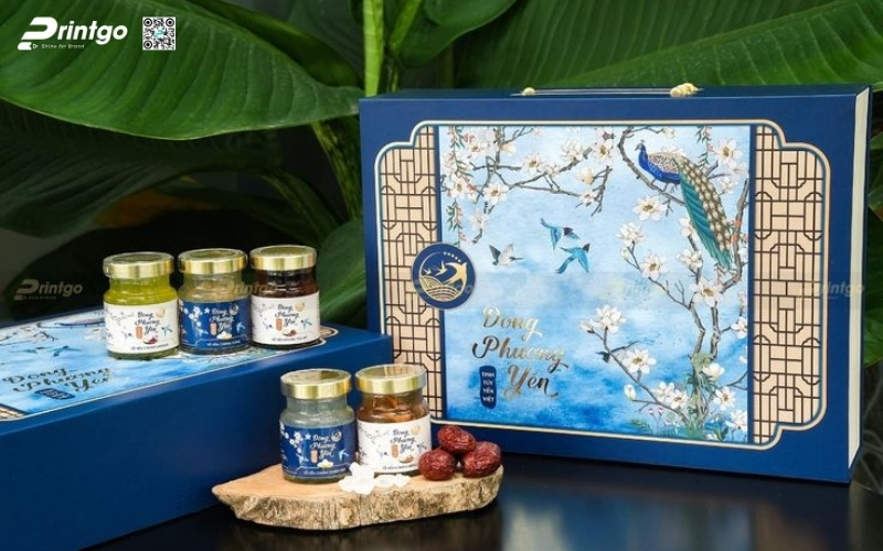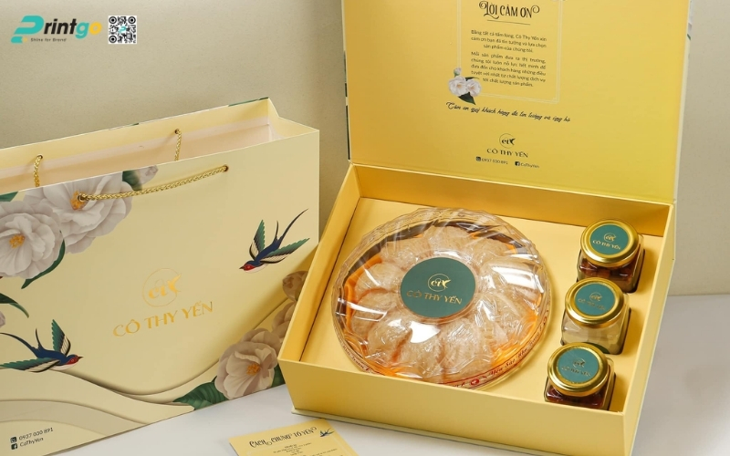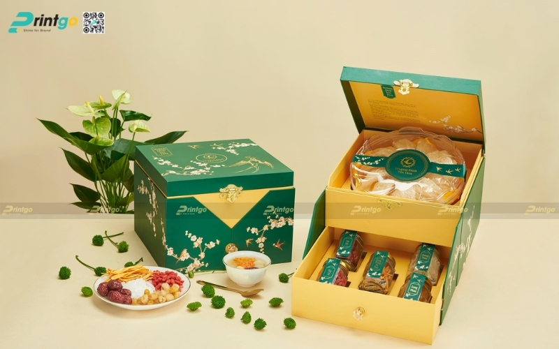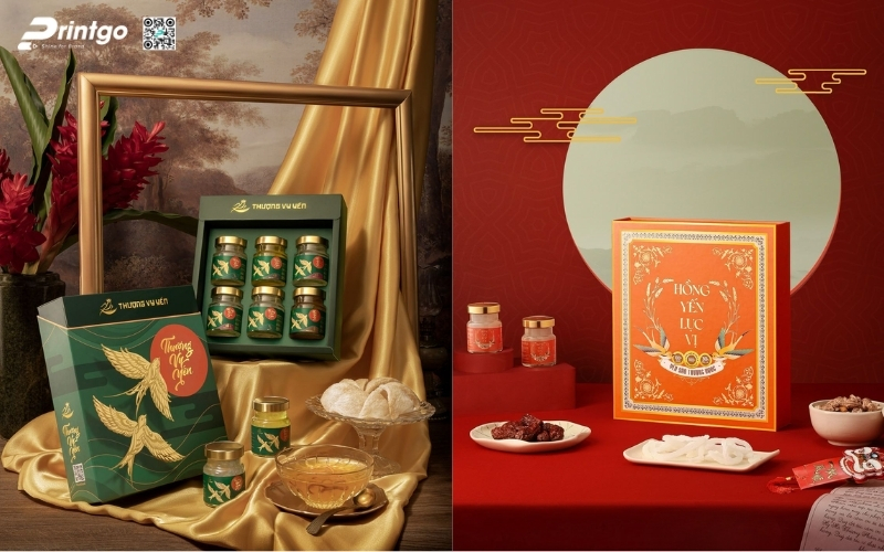 Các mẫu hộp quà yến chưng thường mang phong thái trang trọng, cấu trúc chắc chắn và ưu tiên tính bảo vệ sản phẩm bên trong. Thiết kế phổ biến là dạng hộp 2 tầng hoặc hộp nam châm cạnh, giúp đặt lọ yến gọn gàng và an toàn khi vận chuyển. Các bộ quà Tết OCOP từ yến thường đi kèm tông vàng hoặc đỏ kim, thể hiện sự trân quý, sức khỏe và phúc lộc đầu năm.