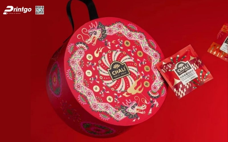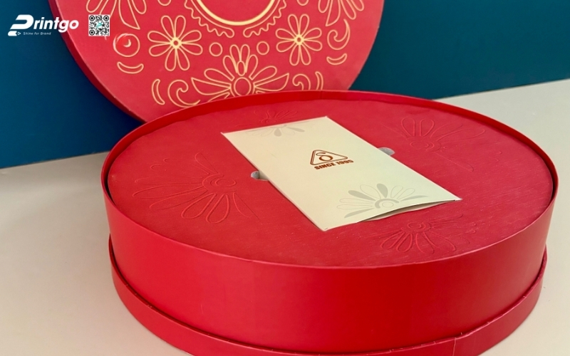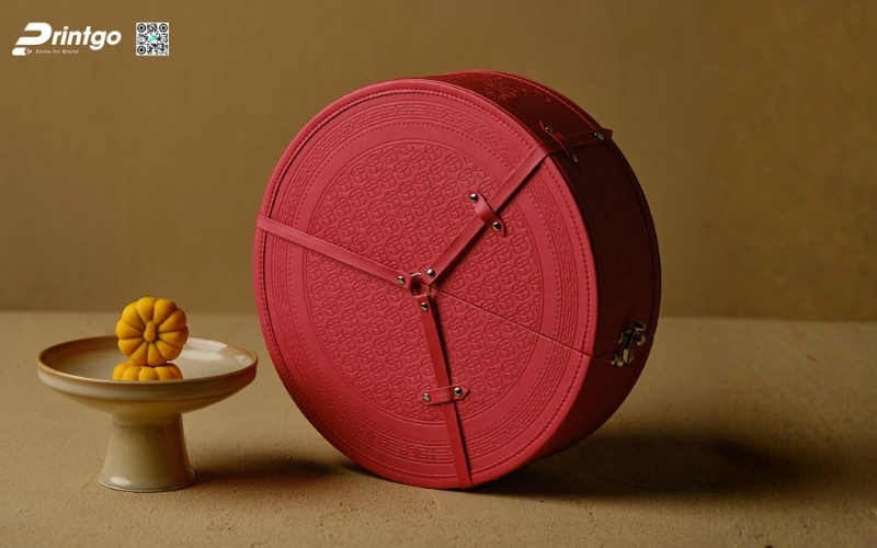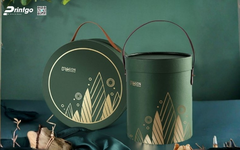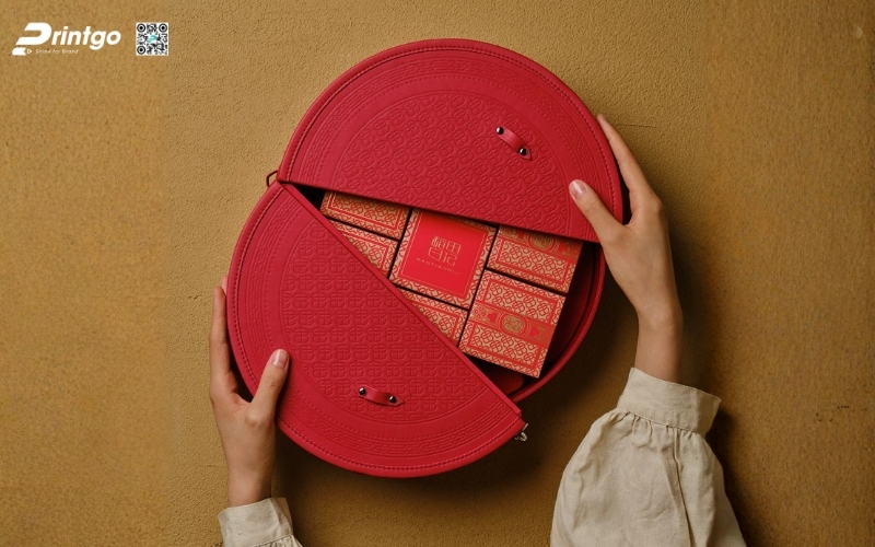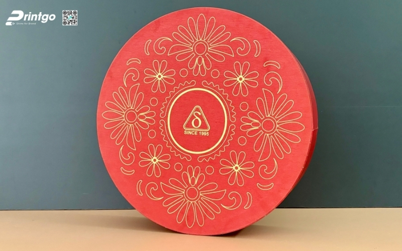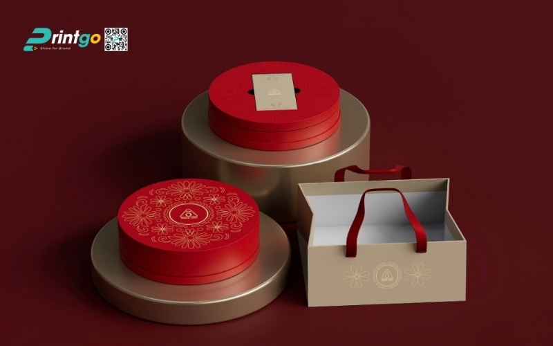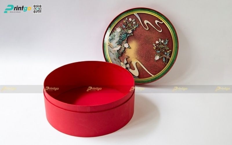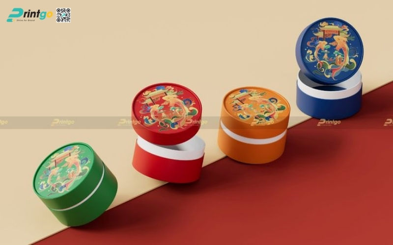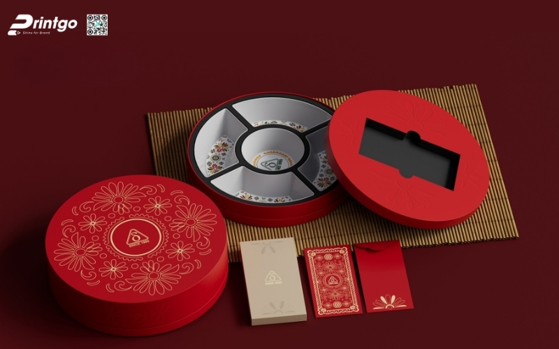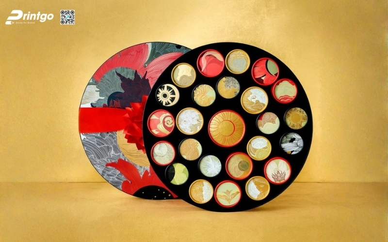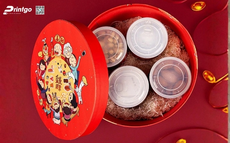 Thiết kế độc quyền, sáng tạo: Printgo cung cấp mẫu hộp Tết tròn thiết kế riêng, sang trọng, phù hợp với thương hiệu doanh nghiệp.