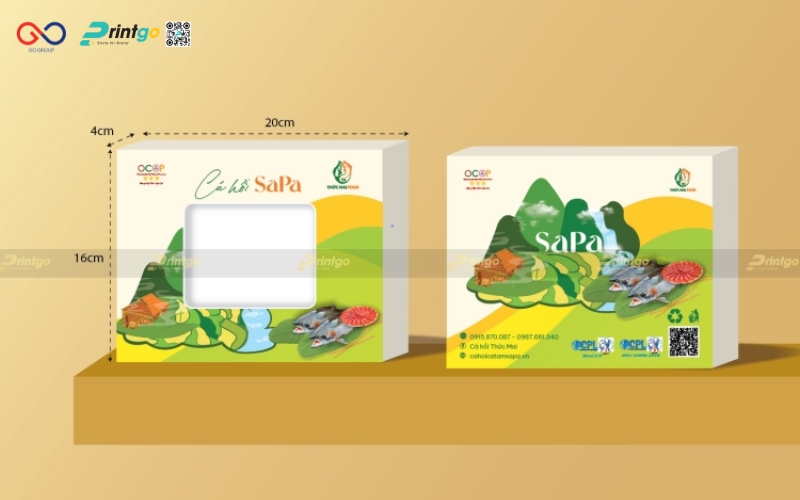 Sau khi đồng hành cùng Printgo, toàn bộ hệ thống bao bì siêu thị được nâng cấp theo hướng chuyên nghiệp và đồng bộ. Thiết kế sử dụng màu xanh chủ đạo gợi thiên nhiên Sapa, kết hợp hình ảnh sản phẩm thực tế giúp tăng độ hấp dẫn ngay từ ánh nhìn đầu tiên. Về quy cách, hộp đựng ruốc cá hồi Sapa được tối ưu với dạng nắp gài chắc chắn, chất liệu carton sóng bền, có thêm quai xách tiện lợi để nâng tầm trải nghiệm và phù hợp làm quà tặng. Đặc biệt, hệ thống thông tin và nhận diện thương hiệu được thể hiện rõ ràng hơn, giúp sản phẩm trở nên chỉn chu và đáng tin cậy khi lên kệ.