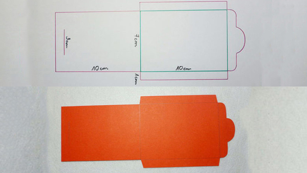 Bước 2: Cẩn thận sử dụng dao dọc giấy để dọc một đường thẳng trên phần lưng của phong bao lì xì, để làm phần nắp cho bao lì xì. Tiếp theo, sử dụng băng dính hai mặt để cố định hai mép gấp hai bên của phong bao lì xì. Sau đó, gấp và dán phần túi cho phong bao lì xì trở nên ngay ngắn và đẹp mắt.