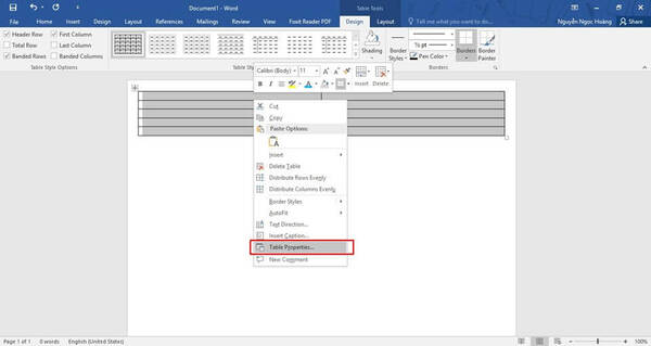 Chọn Menu Insert -> chọn biểu tượng Table dưới thanh công cụ, lựa chọn số hàng và số cột phù hợp theo mong muốn. Ví dụ hình bên dưới chọn 5 hàng và 2 cột. Sau khi chọn kích thước bảng phù hợp, tiếp theo chọn toàn bộ bảng bằng cách tô đậm tất cả các ô. Cuối cùng là kích chuột phải để hiện ra menu tủy chỉnh.