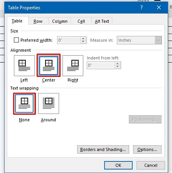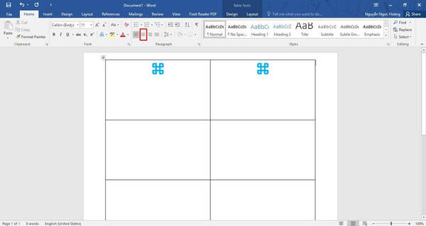 Tìm và nhấn chọn phần Table Properties bên cạnh phần menu phụ, hộp thoại Properties sẽ được hiển thị. Ở mục này,hãy tùy chỉnh để nhập vào canh giữa. Sau khi lựa chọn canh giữa ở Table xong, nhấn chọn tab Cell để tiếp tục chỉnh sửa. Bước này là bước chỉnh sửa kích thước cho danh thiếp. Tích chọn Preferred width và gõ nhập 3,5", nhấn chọn OK để kết thúc.