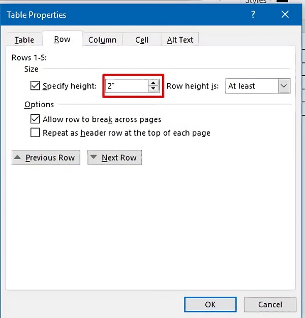 Bước tiếp theo nhấn chọn vào Tab Row và tích chọn vào trường Specify height, nhập 2", nhấn OK để kết thúc.