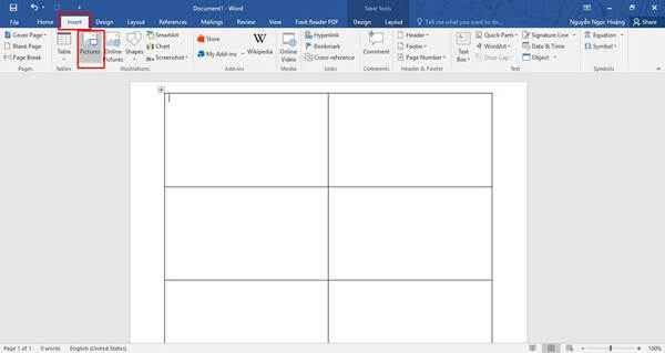 Bước này bạn cần thêm thông tin vào danh thiếp của mình bằng cách nhấn chuột vào ô cần thiết kế, trên thanh Menu vào chọn Tab Insert, chọn biểu tượng Pictures và tìm ảnh logo bạn muốn thêm vào.