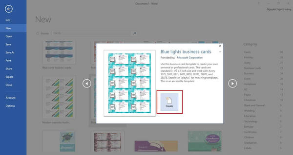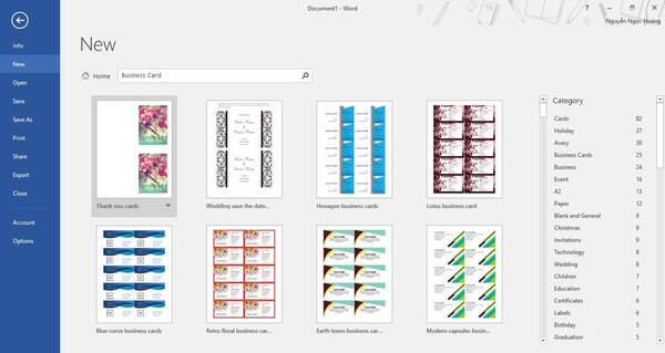 Mở phần mềm Word, chọn New góc bên trái màn hình lúc này màn hình máy tính sẽ xuất hiện 1 ô tìm kiếm, gõ tìm kiếm từ "Business Card" ở khung search và nhấn Entrer. Sau khi tìm kiếm trên màn hình sẽ xuất hiện những mẫu namecard có sẵn.