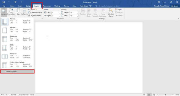Khởi động phần mềm MS Word và mở New như bạn sử dụng Word thông thường. Tiếp theo vào Menu Layout -> Chọn Margin -> Chọn Custom Margin. Mục đích của việc này là thay đổi phần lề đầu và cuối thành 0.25".