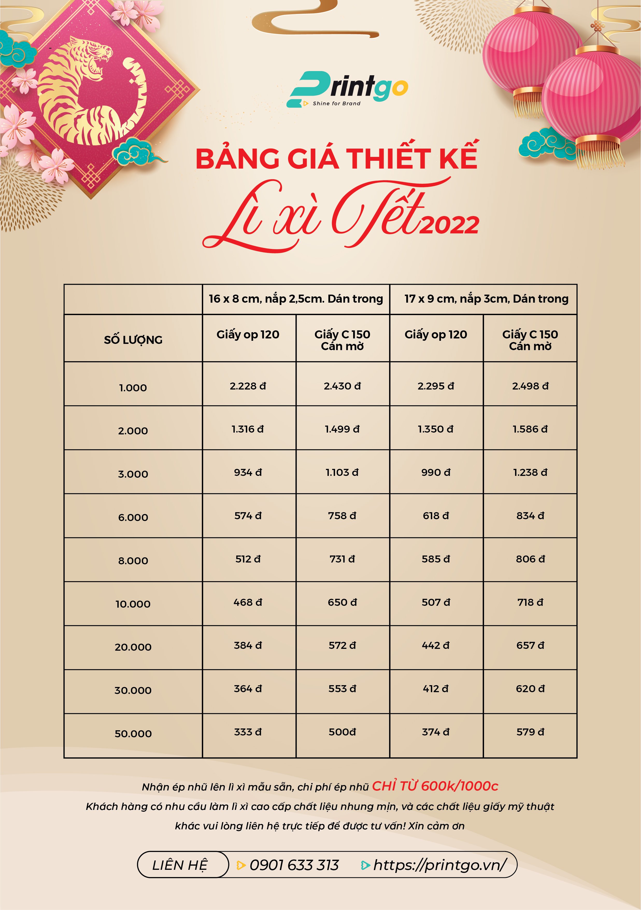 Dưới đây là bảng tổng hợp báo giá in lì xì Tết mới và chính xác nhất tại Printgo