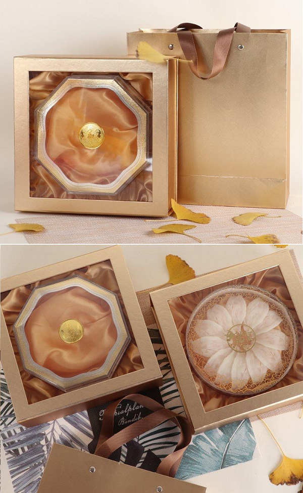 Mẫu hộp giấy đựng yến kiểu hộp cánh bướm - thiết kế sang trọng với phần họa tiết và logo được ép nhũ