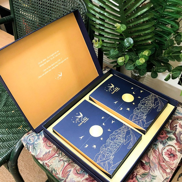Mẫu hộp âm dương có khay định hình dựng vách carton, logo và họa tiết được ép kim vàng cao cấp
