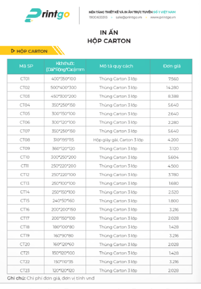 Mỗi mẫu mã, kiểu dáng, số lượng in hộp giấy sẽ có giá trị khác nhau tại mỗi cơ sở in. Nếu như bạn đang băn khoăn không biết giá in ấn hộp giấy là bao nhiêu để cân bằng với ngân sách của công ty, vậy thì hãy tham khảo ngay bảng giá in hộp giấy mới nhất, cập nhật liên tục của Printgo.