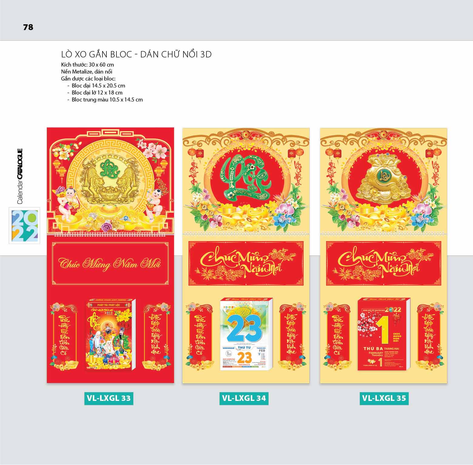 Lịch bloc: là loại lịch mang đậm phong cách cổ truyền dân tộc ta, được đóng thành quyển gồm 365 tờ. Trong đó, mỗi tờ sẽ tương ứng với 1 ngày trong năm và được in đầy đủ thông tin về ngày đó. Lịch bloc được cố định vào 1 bìa cứng và được treo trên tường.